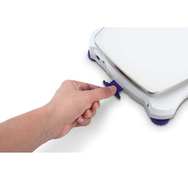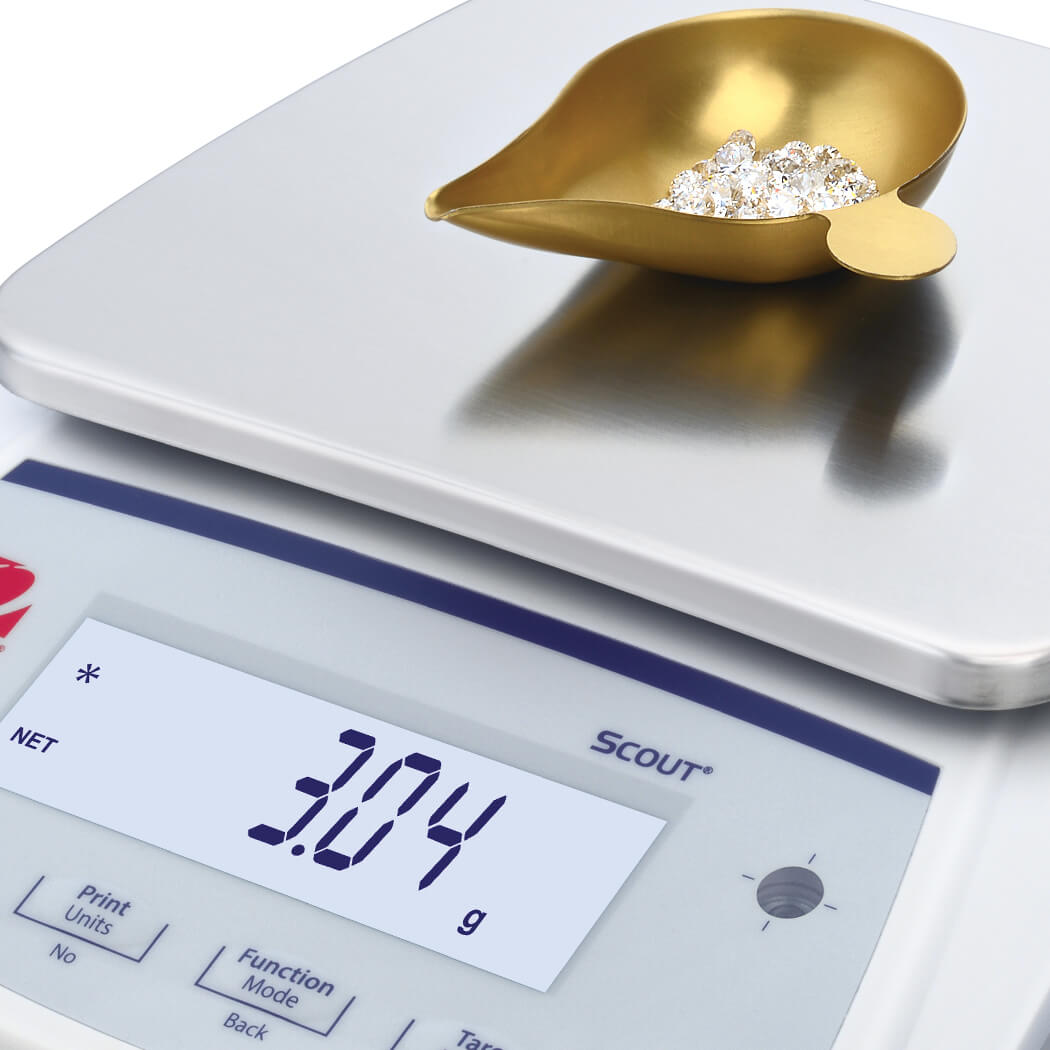 Stabilitätsanzeige, mechanischer und softwarebasierter Über-/Unterlastschutz, Batteriestandsanzeige, automatisches Abschalten und Tarieren, Schüttschale beim 64-g-Modell, Gewicht nur beim 64-g-SJX/E-Modell
